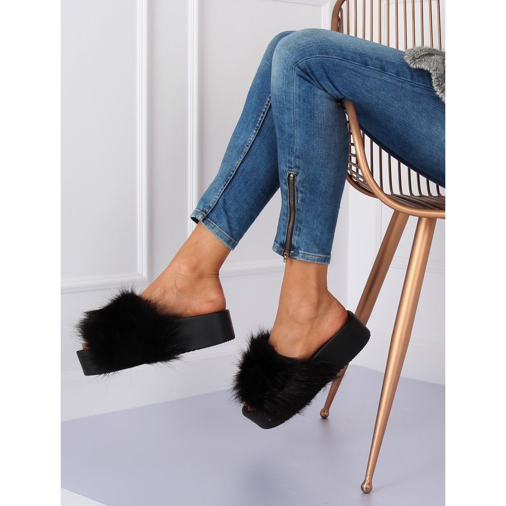 Snygga kvinnors tofflor med mjuk päls, perfekt för vardagsbruk och hem. Modell på en 5 cm hög plattform med en profilerad sula, vilket säkerställer komfort och stabilitet vid varje steg. Talltor är bra både som ett element av avslappnade stiliseringar och lika bekväma hemskor.