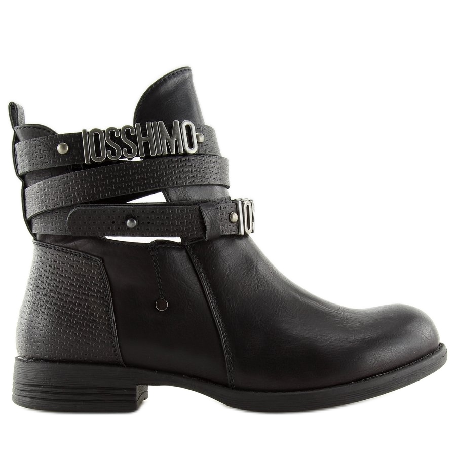 Upptäck den unika charmen med 302-PA Black cut out ankelboots, perfekta för varje kvinna som letar efter originalitet och stil! Dessa svarta ankelstövlar för kvinnor kännetecknas av imponerande utskärningar på sidan av ovandelen och eleganta inlägg gjorda av präglat ekoläder, vilket ger dem en unik karaktär. Fashionabla remmar med inskriptioner lindar subtilt runt fotleden, vilket framhäver deras unika design.