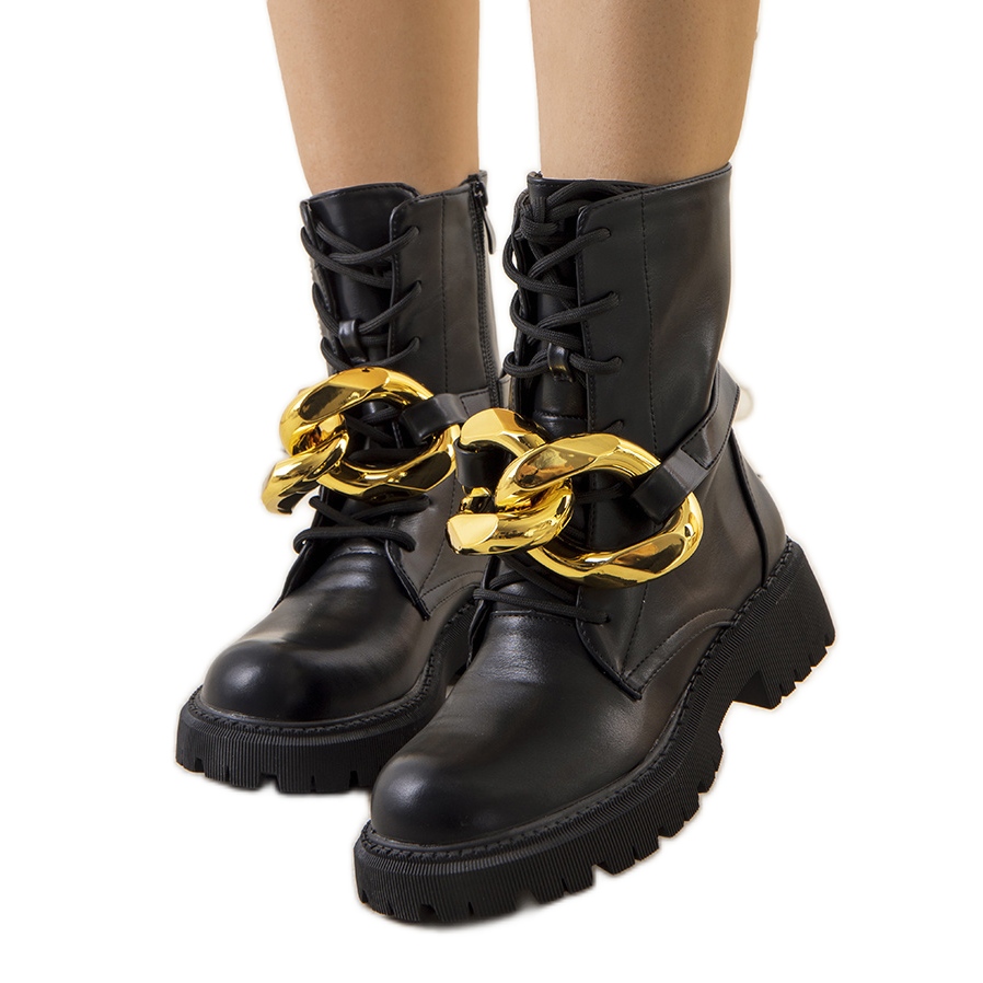 Dessa stövlar är ett absolut måste-ha den här säsongen. Kombinationen av rå, fångare med en elegant, gyllene kedja ger en fashionabel och universell effekt. Den övre delen av ekologiskt läder av hög kvalitet säkerställer komfort och hållbarhet och gummisulastabiliteten varje dag.