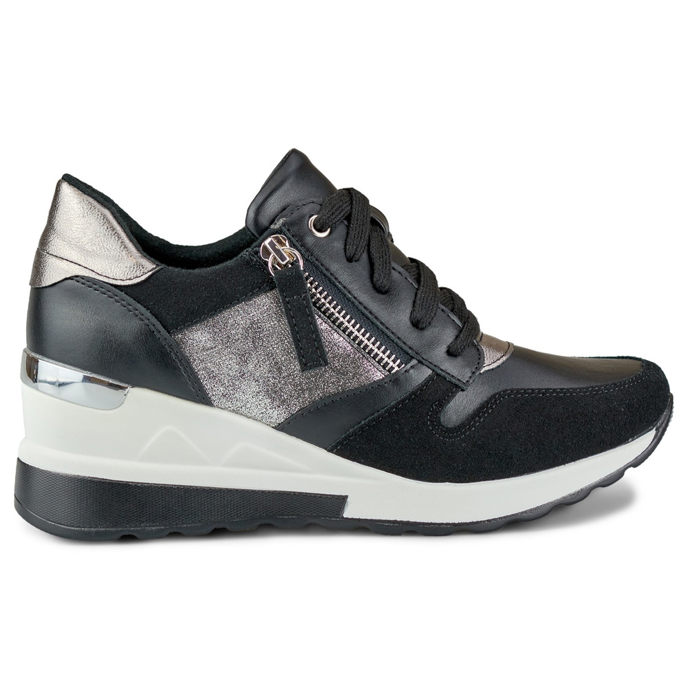 Moderna, feminina och bekväma - svarta sportskor på kilen från Keeshoes -samlingen kombinerar en sportig karaktär med en subtil ökning. Perfekt för stadsstyliseringar, varje dag och utgångar, när du vill lägga till några centimeter utan att ge upp komfort.