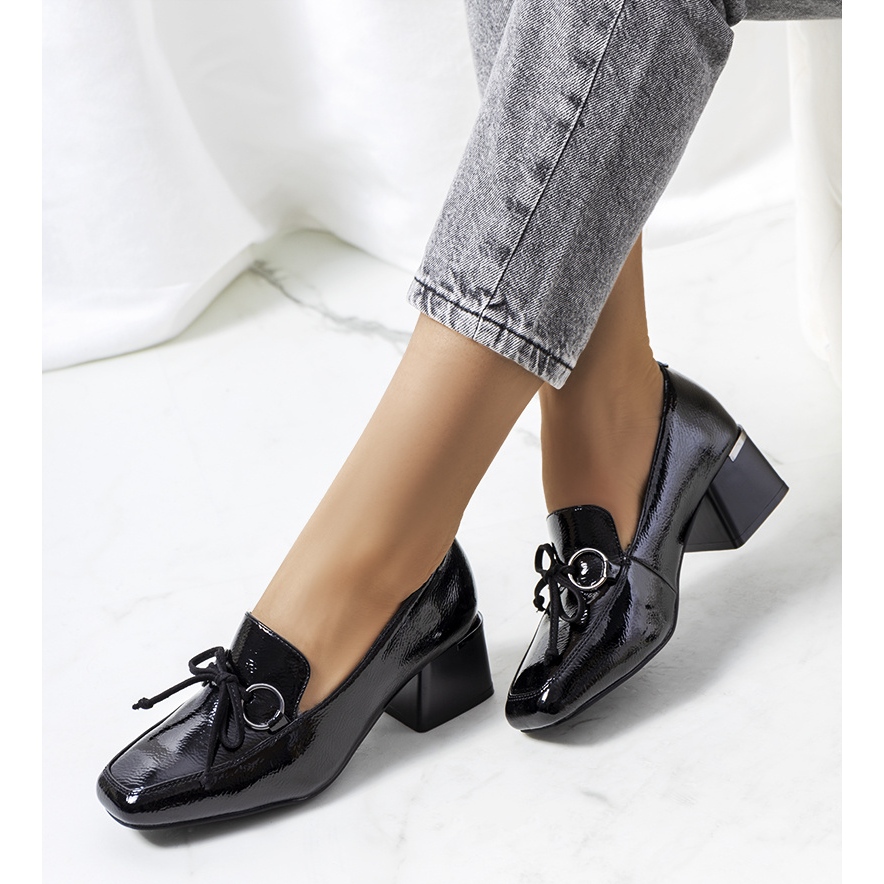 Den lackerade finishen på ovandelen ger dem en subtil glans, och den eleganta 5 cm höga stolpen framhäver effektivt den feminina siluetten. Ett perfekt val för olika tillfällen - från vardagsutflykter, via arbetsmöten, till kvällsutflykter.