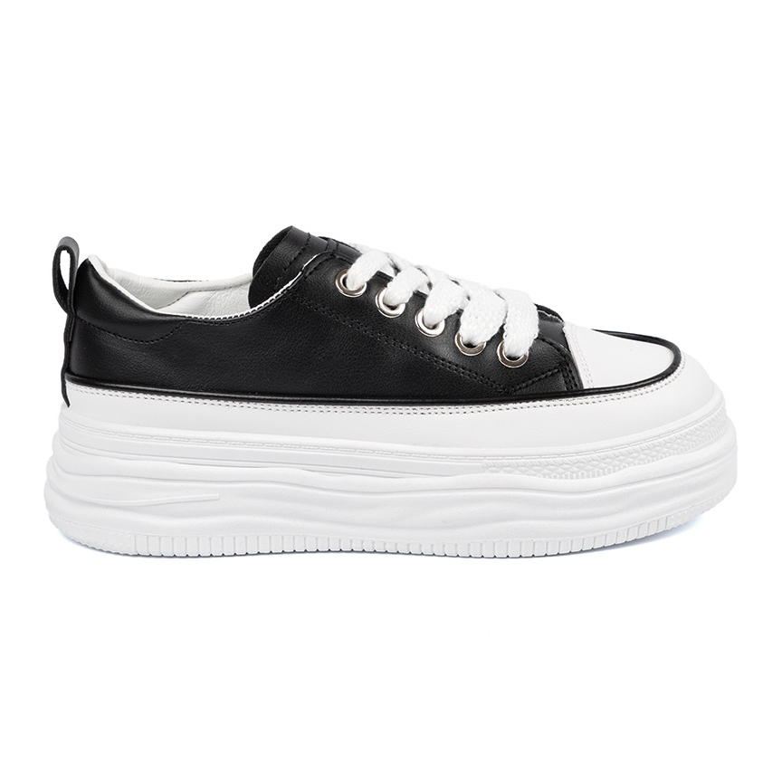 Sneakers kännetecknas av en klassisk svart färg med vita accenter som ger dem ett modernt utseende. Den 4,5 cm höga plattformen säkerställer utmärkt dämpning och komfort att bära hela dagen, och tack vare den inbyggda, mjuka foderna stöds foten solid. Den runda näsan lägger till ytterligare charm och gör sneakers inte bara funktionella utan också snygga.