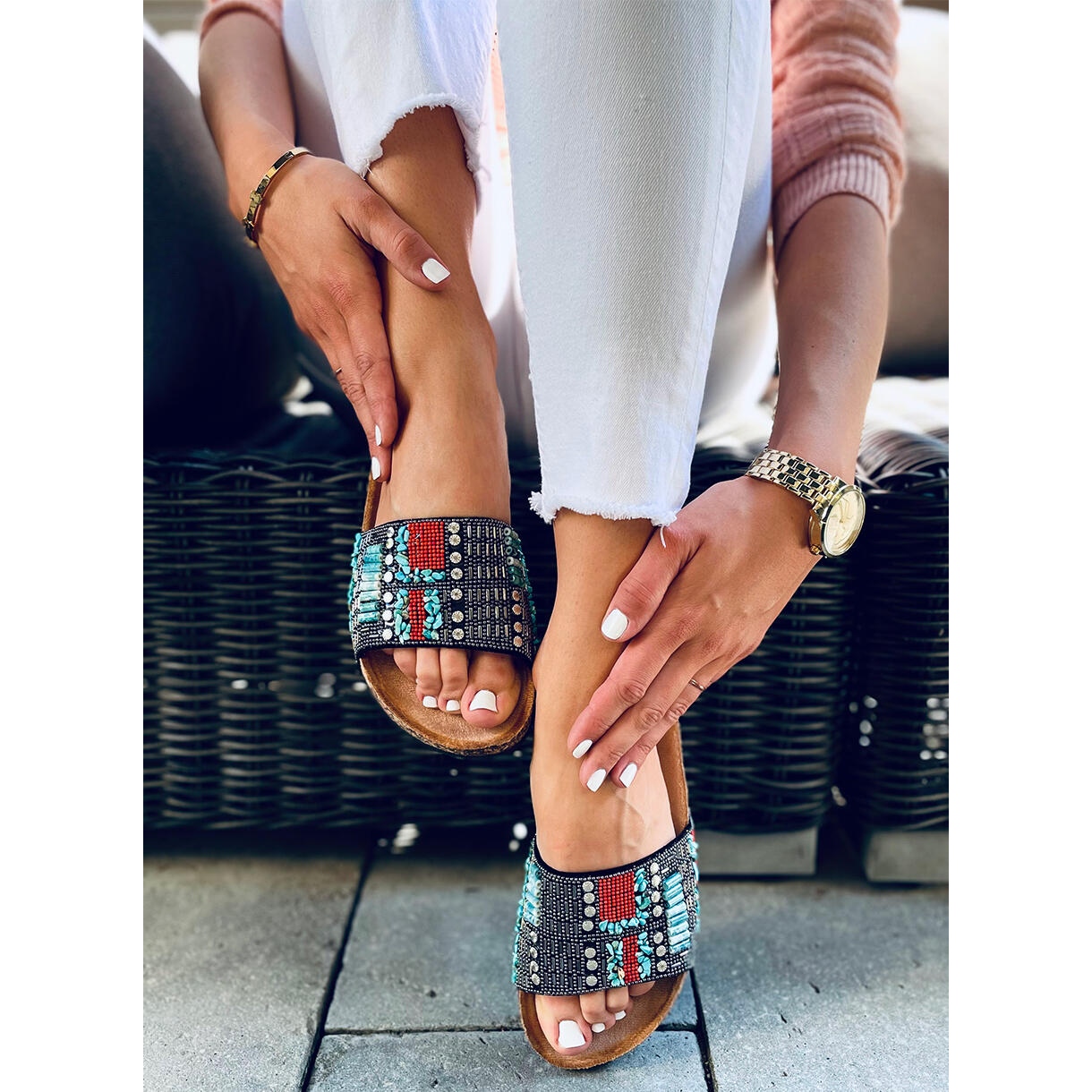 Taida svarta korkflip-flops i svart är ett utmärkt val för kvinnor som värdesätter komfort och ett moderiktigt utseende. Tillverkad av ekologisk mocka av hög kvalitet, den här modellen ser extremt elegant ut, och imponerande dekorationer i etnisk stil ger den en unik karaktär.