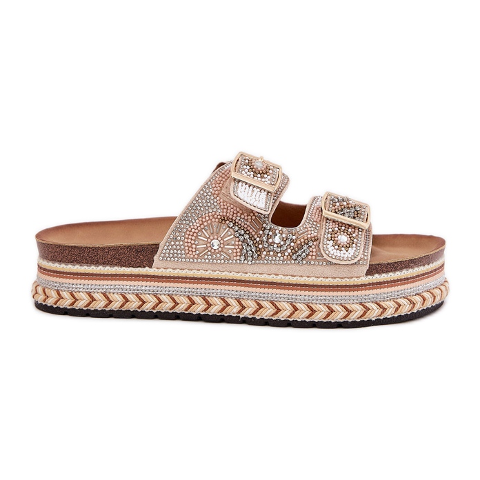 Deras attraktiva dekorationer och moderna ränder med spännen får dem att se ögat och lägga till karaktären på varje skapelse. Tack vare införandet är det snabbt och bekvämt att lägga på dem. Den 4 cm höga plattformen garanterar inte bara ett snyggt utseende, utan också komforten att bära hela dagen.