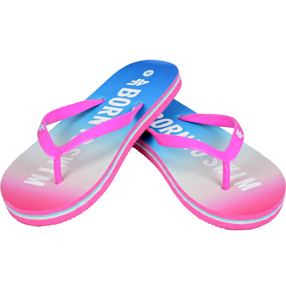 Färgglada 4F -flip -flops avsedda för flickor - perfekt för stranden, för trädgården och för vardagens sommaraktiviteter. De har en lätt, dämpande EVA -sula och hållbara gummiband, vilket säkerställer komforten vid användning och enkla rengöring.