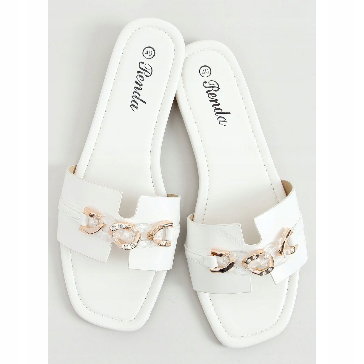 Upptäck vita flipflops med en dekorativ kedja 35-230 White, som säkerligen kommer att komplettera din vardagsgarderob! Dessa eleganta och snygga damtofflor kännetecknas av en unik, moderiktig kedja dekorerad med stenar, som attraherar ögat och ger helheten en raffinerad karaktär. Tack vare den platta hälen (höjd 1 cm) är de inte bara moderiktiga, utan också extremt bekväma - perfekta för vardagsbruk.