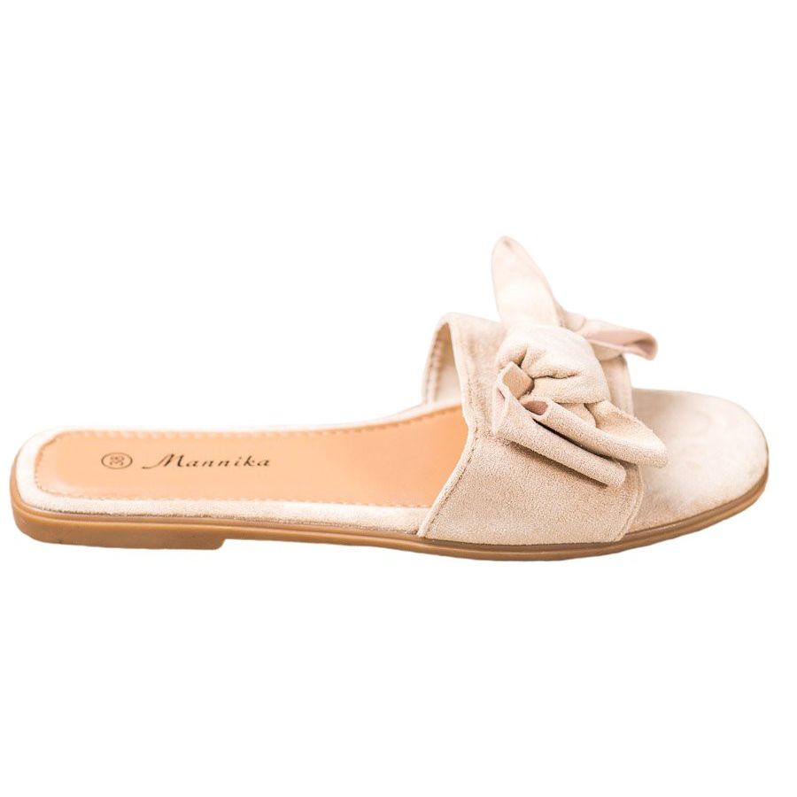 Mannika flip-flops är slip-on och har en öppen häl vilket gör dem extremt lätta att ta av och på. En slät syntetsula med en höjd på 1 cm garanterar komfort under vardagliga promenader. En ytterligare fördel är en charmig båge som ger dem en unik karaktär.