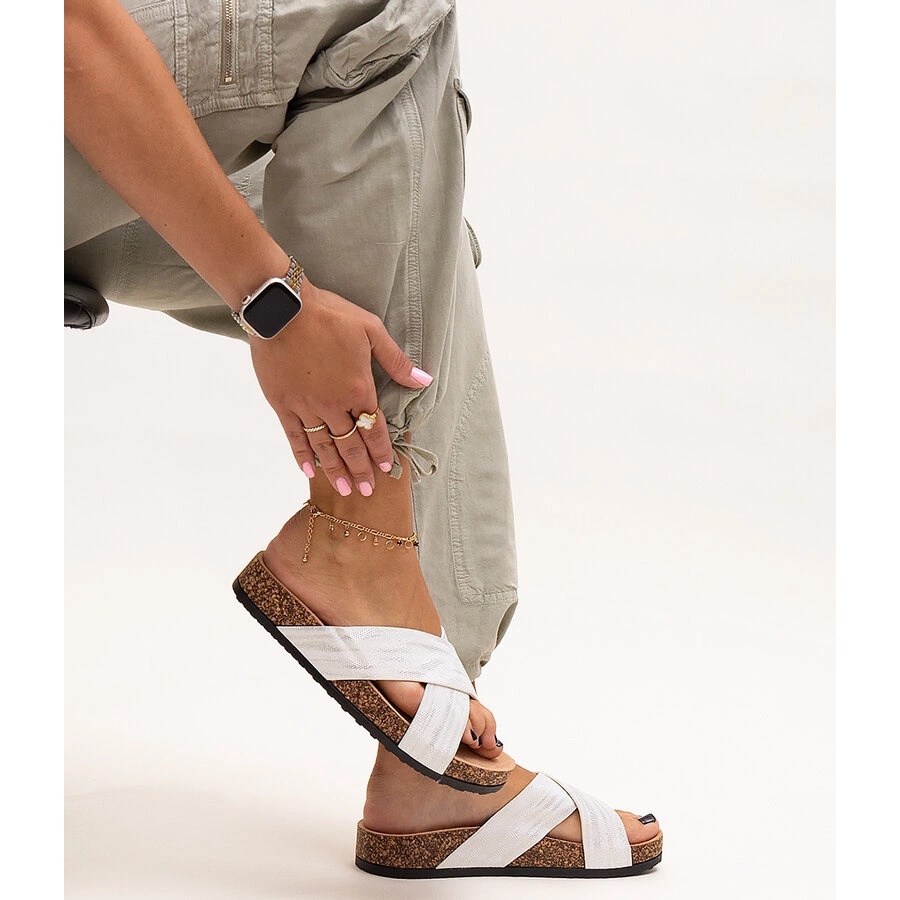 Upptäck ovanliga Kaps på en korksula med en glans i vitt - perfekt för varma sommardagar! Dessa eleganta slip -i skor med en rund näsa är en kombination av elegans och komfort som du uppskattar under vardagliga aktiviteter. Tillverkade av gummi av hög kvalitet, de säkerställer hållbarhet och komfort att bära, och deras designerutseende kommer att göra dig öga vid varje steg.