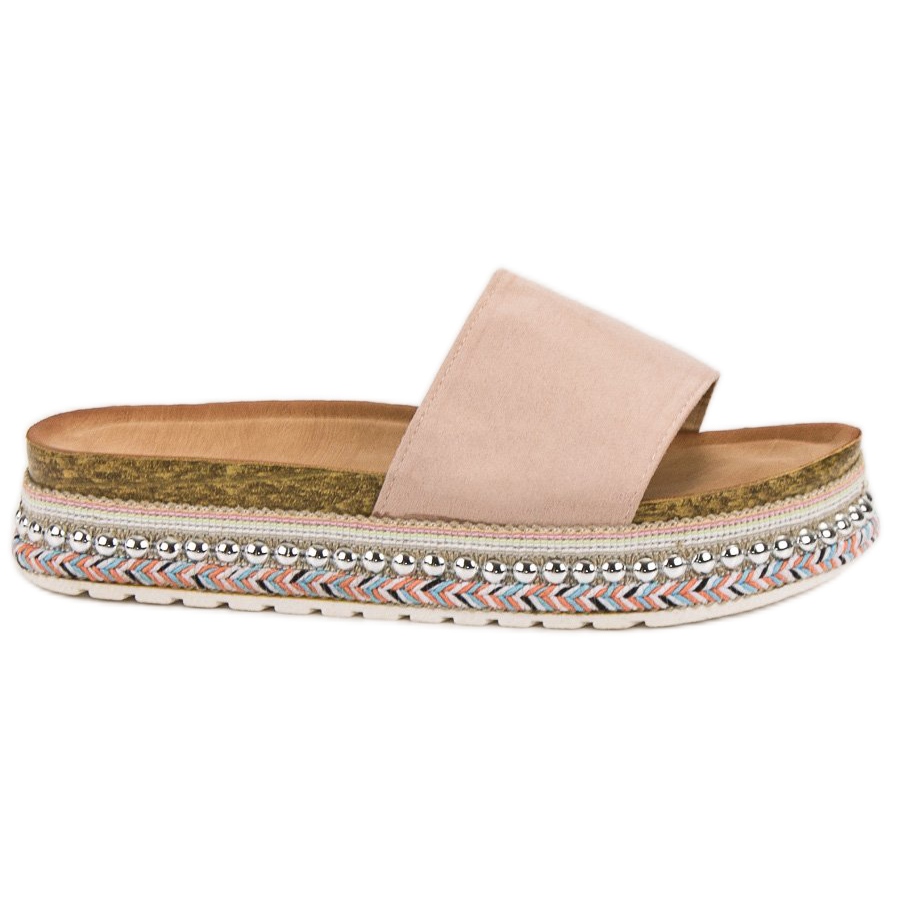 Det här är fashionabla plattformsflip-flops från Cm Paris som kommer att tillföra friskhet till din sommargarderob. Tillverkade av högkvalitativt ekologiskt mockaskinn i en ljusbrun färg, de är ett idealiskt alternativ för varma dagar. Tack vare den låga plattformen, 4 cm höga, är de bekväma att bära, vilket gör dem till ett perfekt val både för stranden och för urban styling.