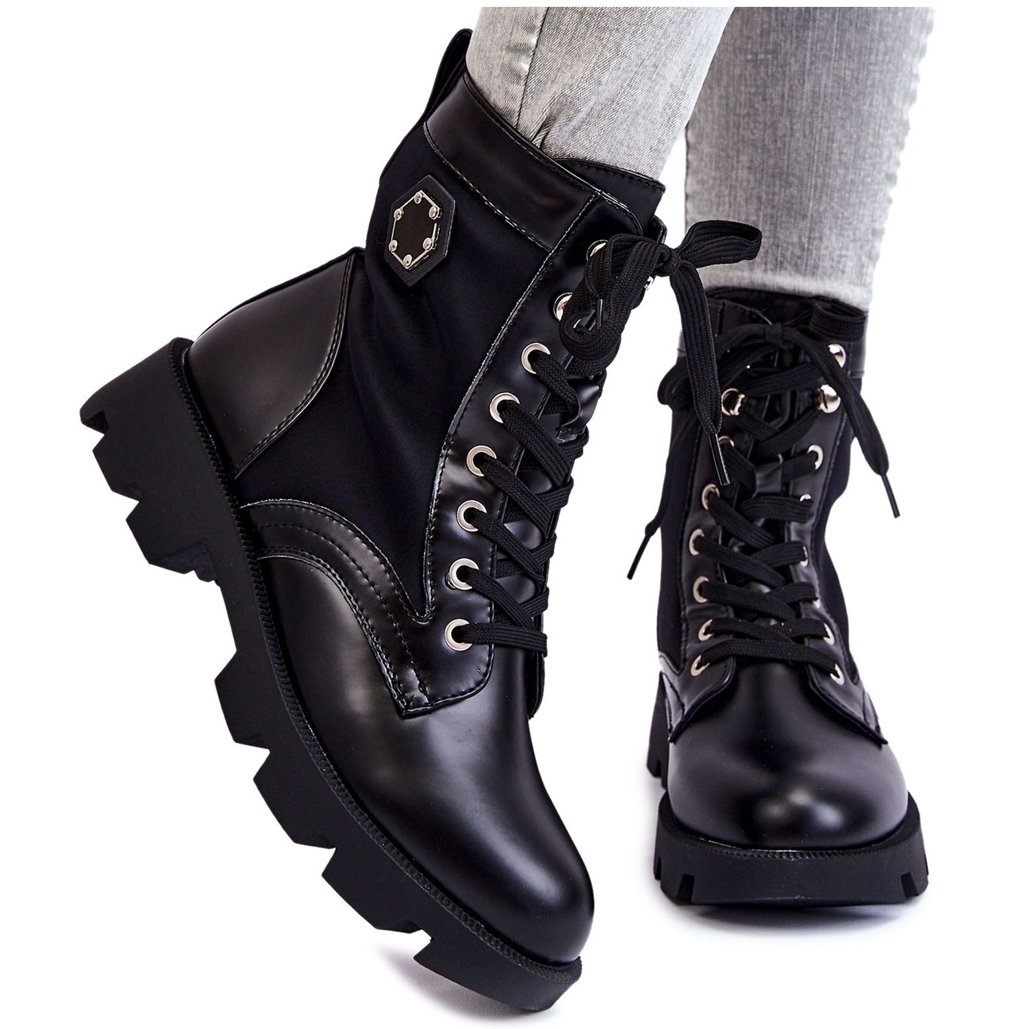Här är den perfekta kombinationen av stil och komfort - damstövlar PG1 med snörning i en elegant svart färg. Dessa fashionabla skor är ett perfekt val för kvinnor som värdesätter både funktionalitet och estetik. Stövlarna är noggrant gjorda av en kombination av ekologiskt läder och textilmaterial, vilket garanterar deras hållbarhet och komfort att bära.
