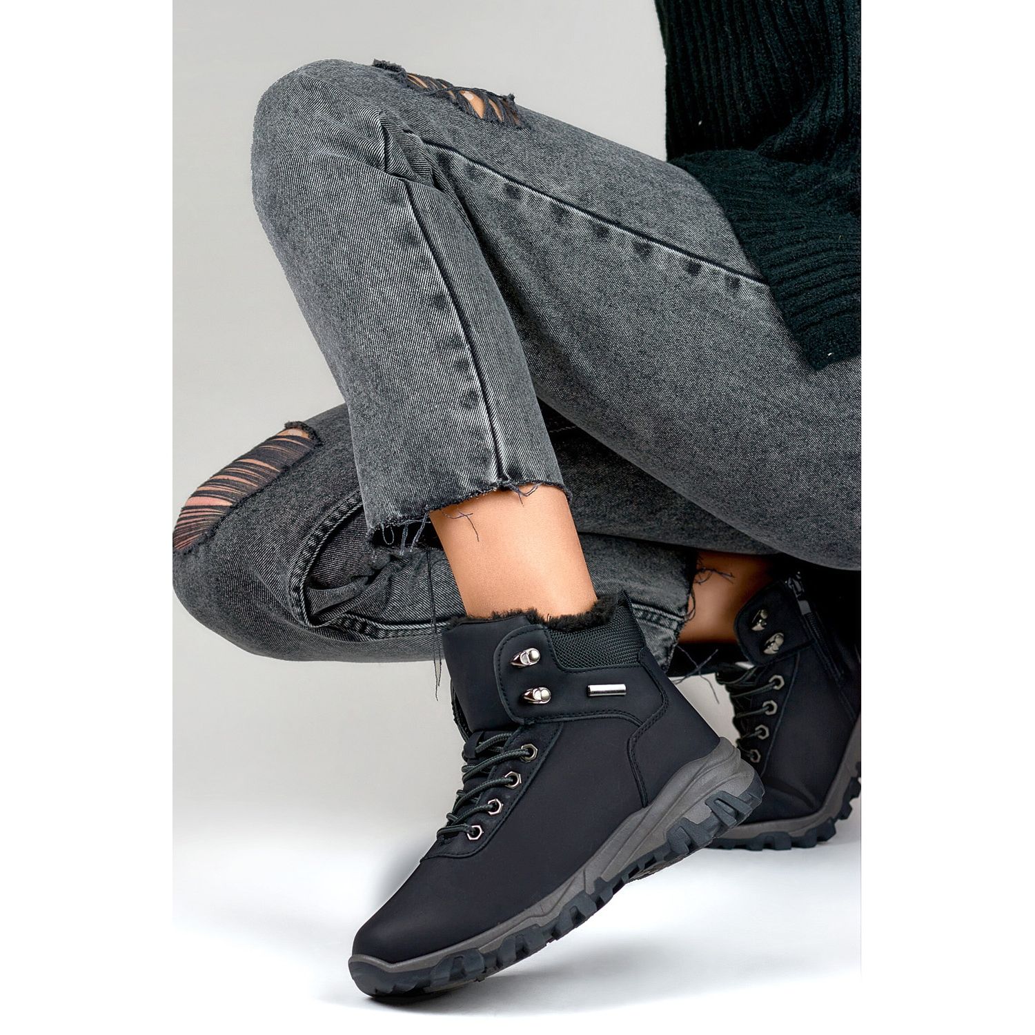 Skorna i den svarta finishen ser klassiska och universella, tack vare vilka de smälter in perfekt både i stadsstyliseringar och som solida utomhusskor.