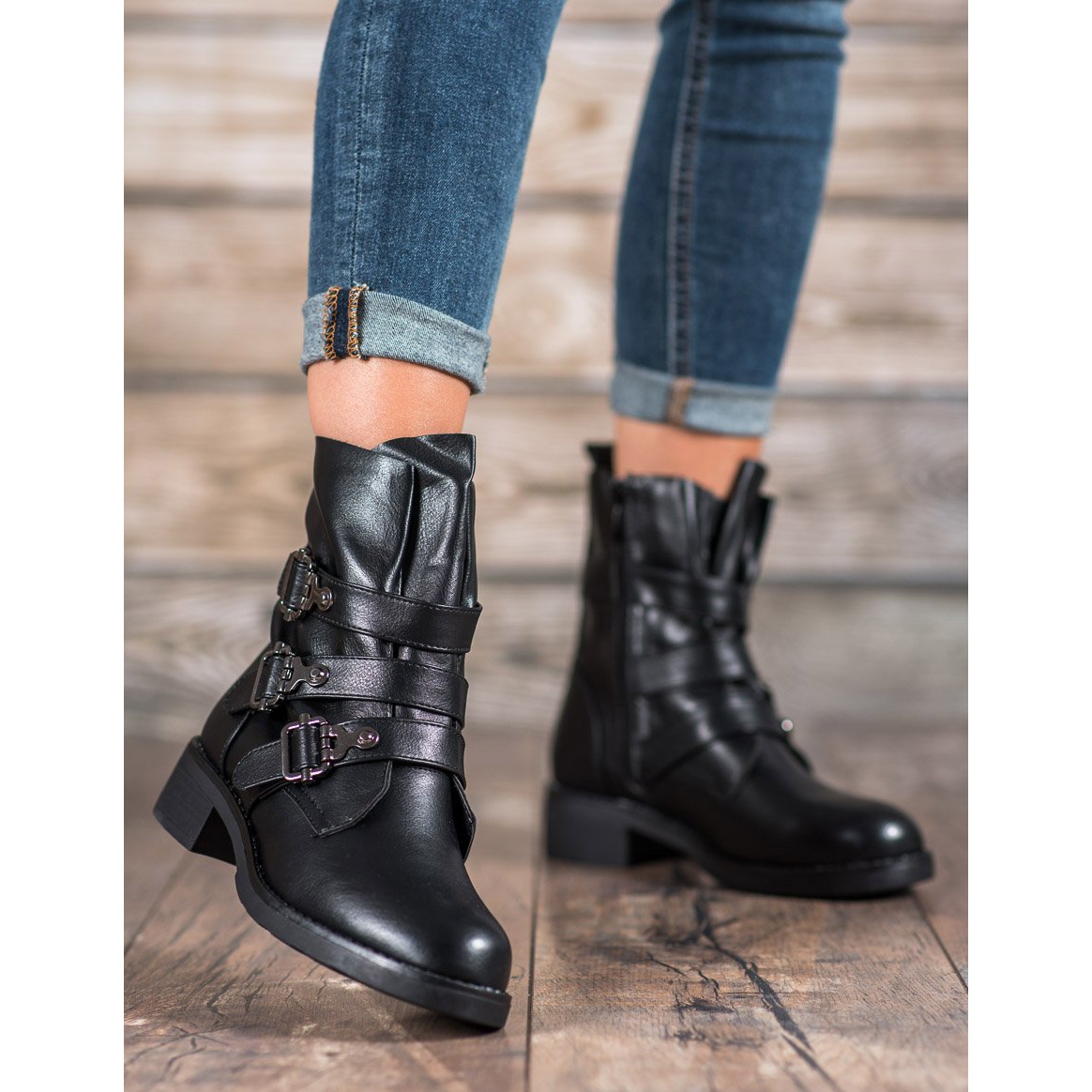 Deras ovanliga övre och dekorativa remmar med spännen ger dem en originell karaktär, vilket gör att de passar perfekt in i olika stilar. De kommer att vara det perfekta komplementet till både avslappnade och rockiga outfits, perfekta för höst/vintersäsongen.