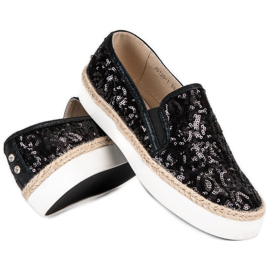 Vi presenterar fashionabla J. Star-sneakers för kvinnor i en elegant svart färg, som perfekt kombinerar sportig komfort med sensuell tjejighet. Dessa unika skor, dekorerade med glänsande paljetter och strass, drar till sig uppmärksamhet och ger karaktär till varje styling.