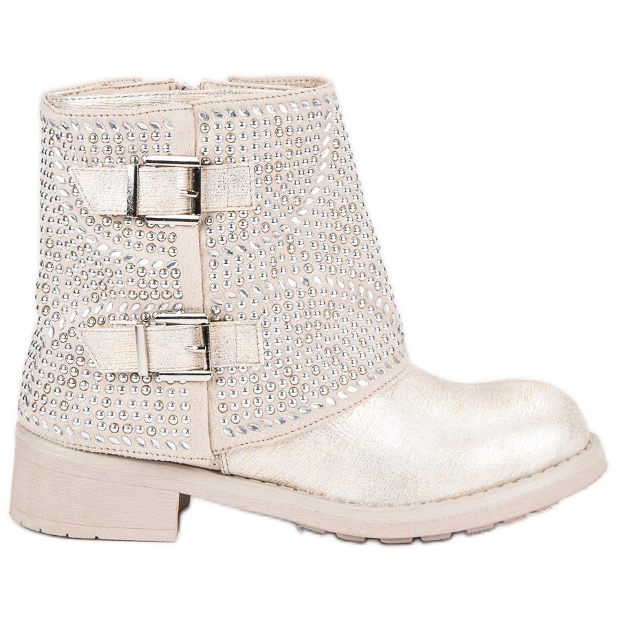 Den snygga bruna färgen på stövlarna passar perfekt in i trender, och ytterligare detaljer, som strass och metalliska accenter, ger dem en unik karaktär. Den 3,5 cm platta hälen gör stövlarna bekväma och praktiska, perfekta för både vardagsstyling och mer eleganta outfits.