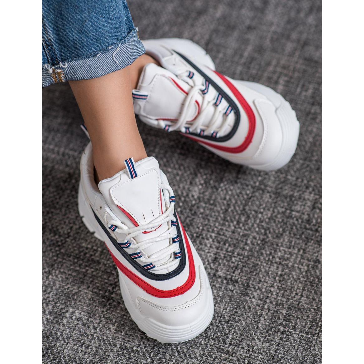 Upptäck Weide fashionabla platåskor i en klassisk vit färg, som säkert kommer att bli ditt favoritelement i din garderob. Dessa eleganta och sportiga sneakers kännetecknas av röda och svarta fälgar, som ger dem karaktär.