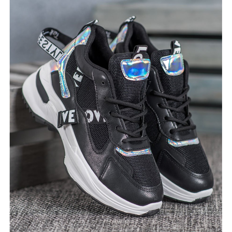 Fashionabla Weide sneakers i svart är det perfekta valet för alla fashionistas som värdesätter kombinationen av komfort och modern stil. Dessa sportskor kännetecknas av iögonfallande, dekorativa inskriptioner och holografiska insatser som lägger till originalitet och fräschör till dem.