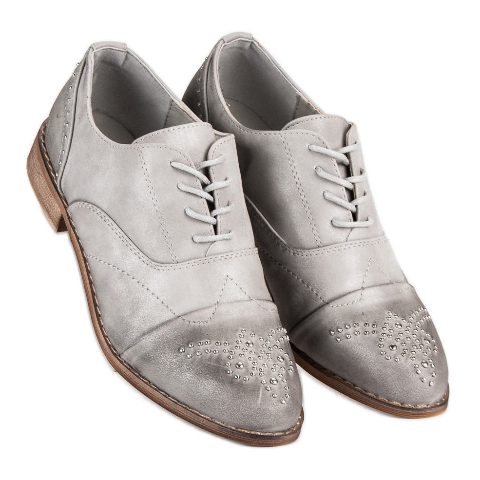 Deras grå färg, berikad med känsliga skavsår, gör dem lätta att matcha till olika outfits. Tack vare dekorationen med strass får skorna karaktär och kombinerar klassisk elegans med moderna accenter. Snörad framtill säkerställer denna modell en perfekt passform, och en platt 2,5 cm hög sula säkerställer bekvämt att bära hela dagen.