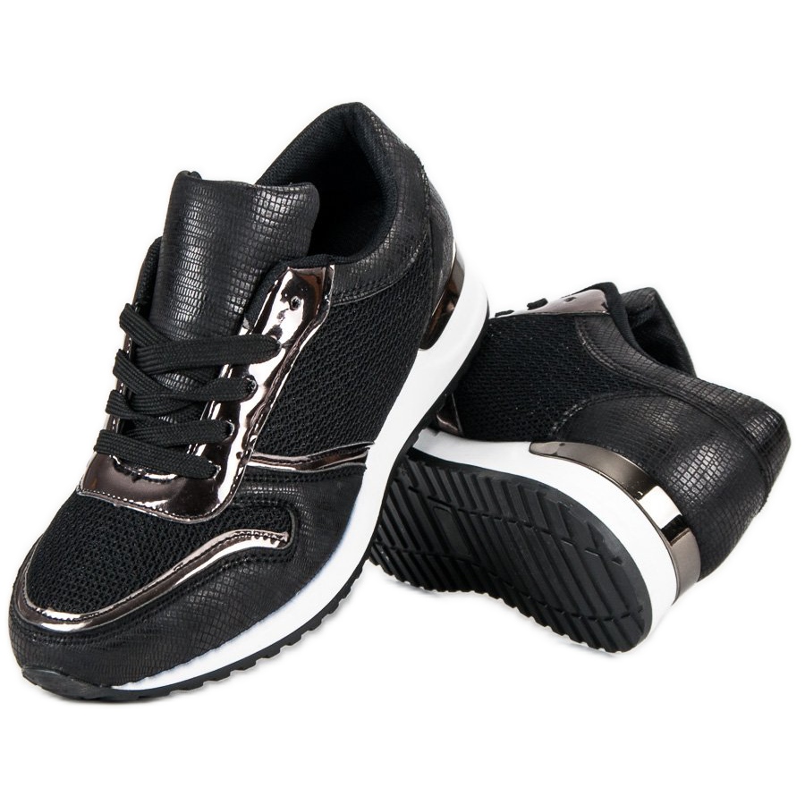 Upptäck komfort och stil med fashionabla svarta sportskor! Dessa damsneakers är en kombination av modern design och praktiska lösningar som kommer att möta varje aktiv kvinnas förväntningar. Tillverkade av högkvalitativt textilmaterial, med eleganta inlägg gjorda av gyllene ekologiskt läder, lockar dessa skor uppmärksamhet och ger karaktär till vardagens styling.