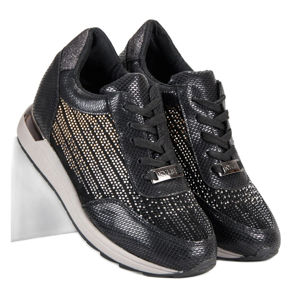 Kylie Black Fashionabla sportskor kännetecknas av en gummisula med slitbana, vilket säkerställer utmärkt grepp och stabilitet, oavsett aktivitet. Den runda tån tillför lätthet och ytterligare element, som strass och strass, ger skorna en unik karaktär och moderiktigt uttryck.