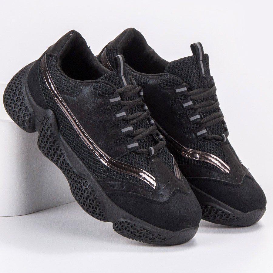 SHELOVET Fashionabla svarta sportskor är ett idealiskt erbjudande för kvinnor som värdesätter komfort och modern stil. Dessa unika sportskor kännetecknas av en dekorativ, glänsande rem som tillför elegans och originalitet till dem. Tack vare den tjocka sulan av syntetiskt material isolerar skorna foten perfekt från marken, vilket säkerställer komfort under vardagliga promenader och aktiviteter.