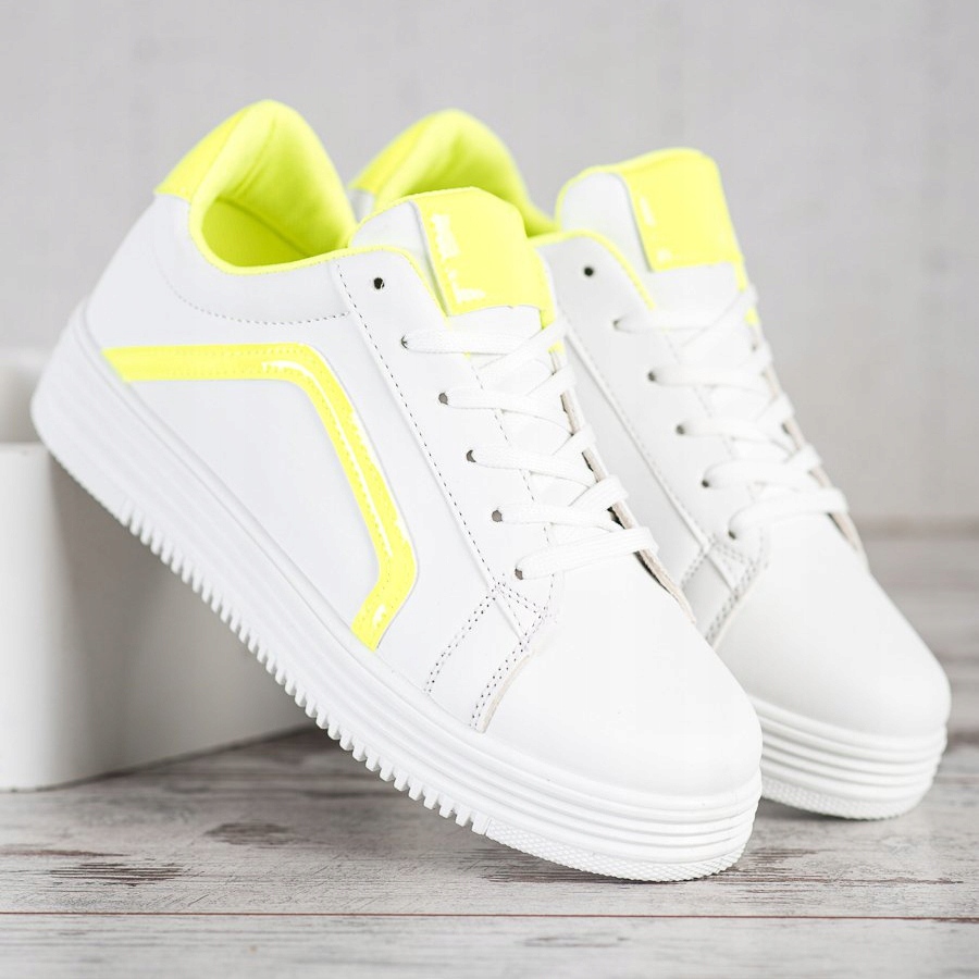SHELOVET Fashionabla sportskor är ett utmärkt val för kvinnor som värdesätter komfort och stil. Dessa vita sportskor är gjorda av högkvalitativt material som imiterar läder, vilket säkerställer ett elegant utseende och lättskött. Ljusgula inlägg på sidorna och den övre delen av skorna ger dem en unik karaktär, lockar uppmärksamhet och framhäver den sportiga stilen.
