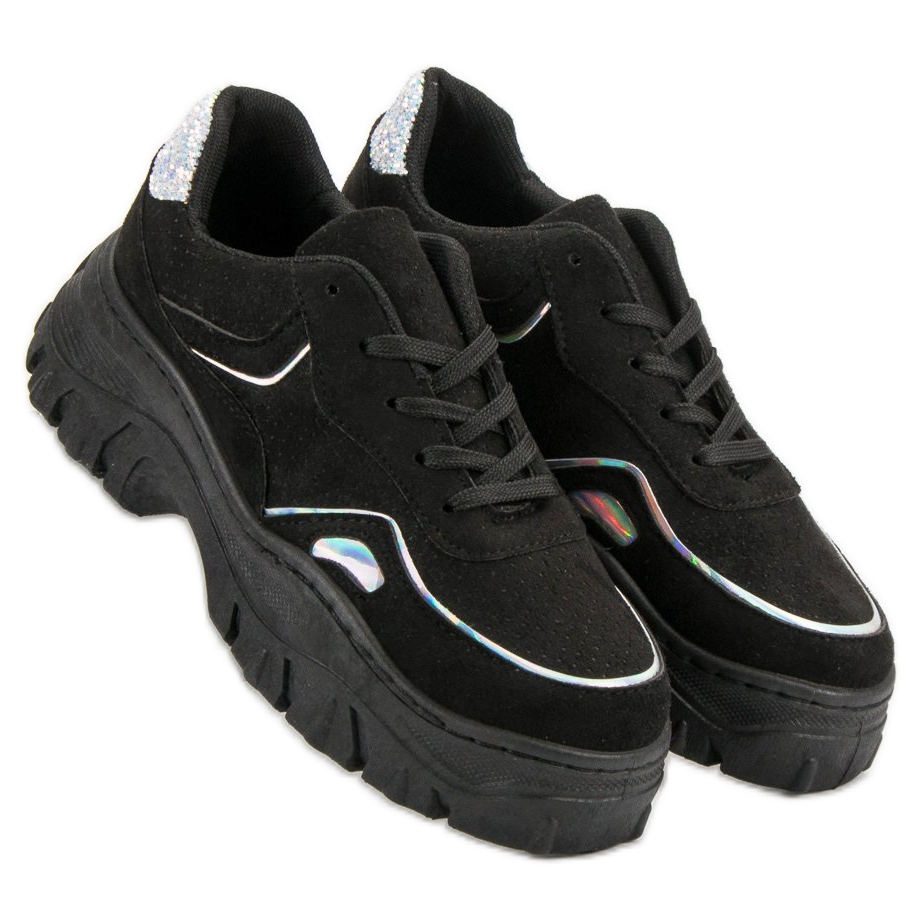 Den medelhöga 5-centimeters plattformen i en levande svart färg absorberar stötar perfekt och säkerställer komfort under långa promenader. Dessutom ger delikat glitter och glänsande inlägg dem en unik karaktär, vilket gör dem till ett perfekt komplement till all sportstyling.