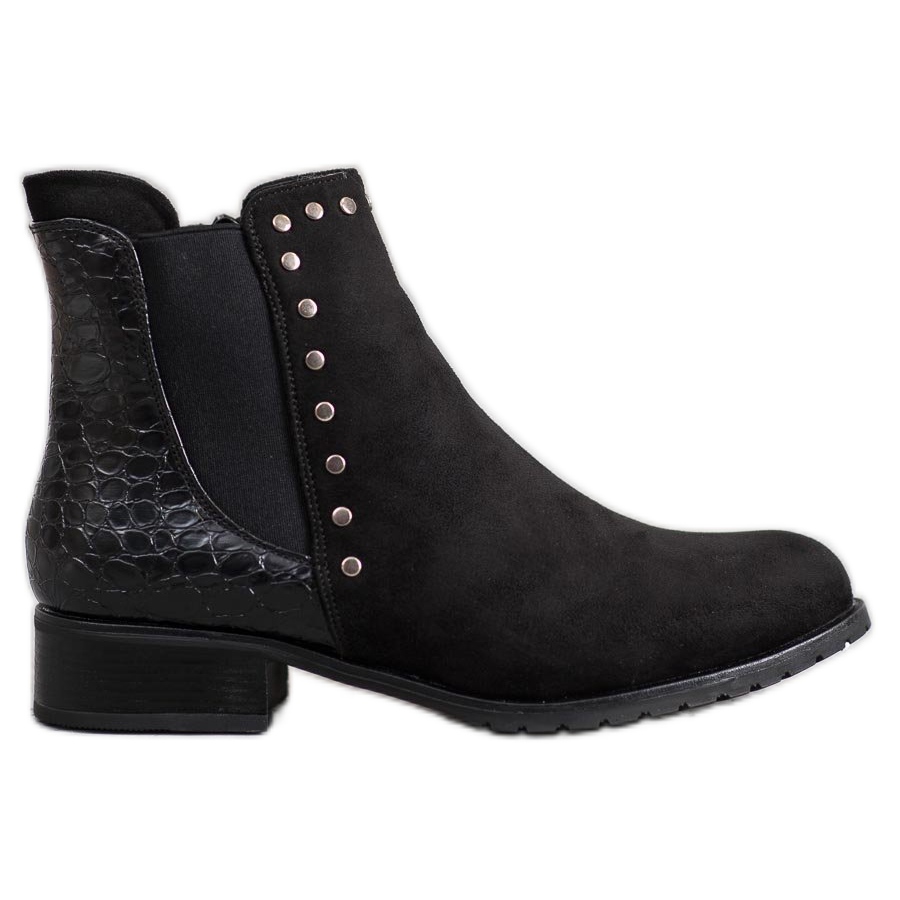 Här är det perfekta valet för varje kvinna som vill kombinera mode med komfort - fashionabla svarta SHELOVET ankelboots. Dessa originalkängor är ett perfekt komplement till många vardagsstilar, samtidigt som de garanterar komforten att bära. Ovandeln gjord av mockaläderliknande material, dekorerad med silverstrassstenar, väcker uppmärksamhet och ger skorna en unik karaktär. Baksidan av stövlarna med krokodillädermotiv ger en touch av elegans och stil.