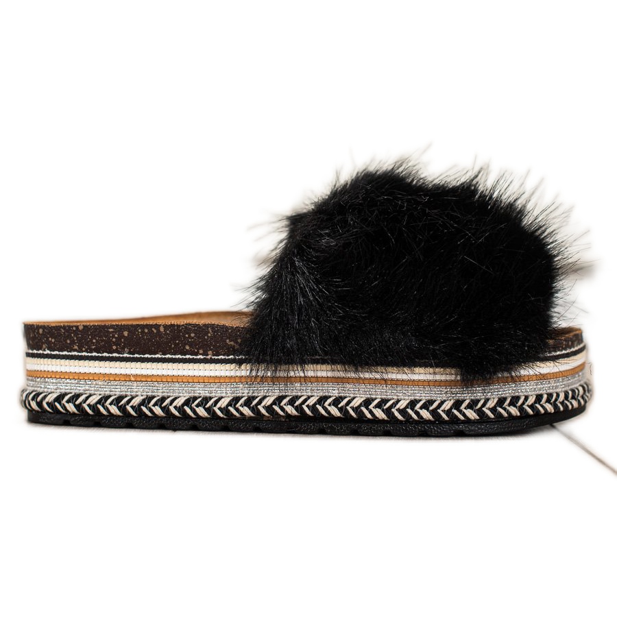 Den 4 cm höga plattformen, täckt med mjuk konstgjord päls, ger inte bara en moderiktig karaktär, utan säkerställer också komfort under användning. Öppna tår och häl ger dem lätthet och frihet, och slip-on-fästet gör det extremt enkelt att sätta på och ta av dem.