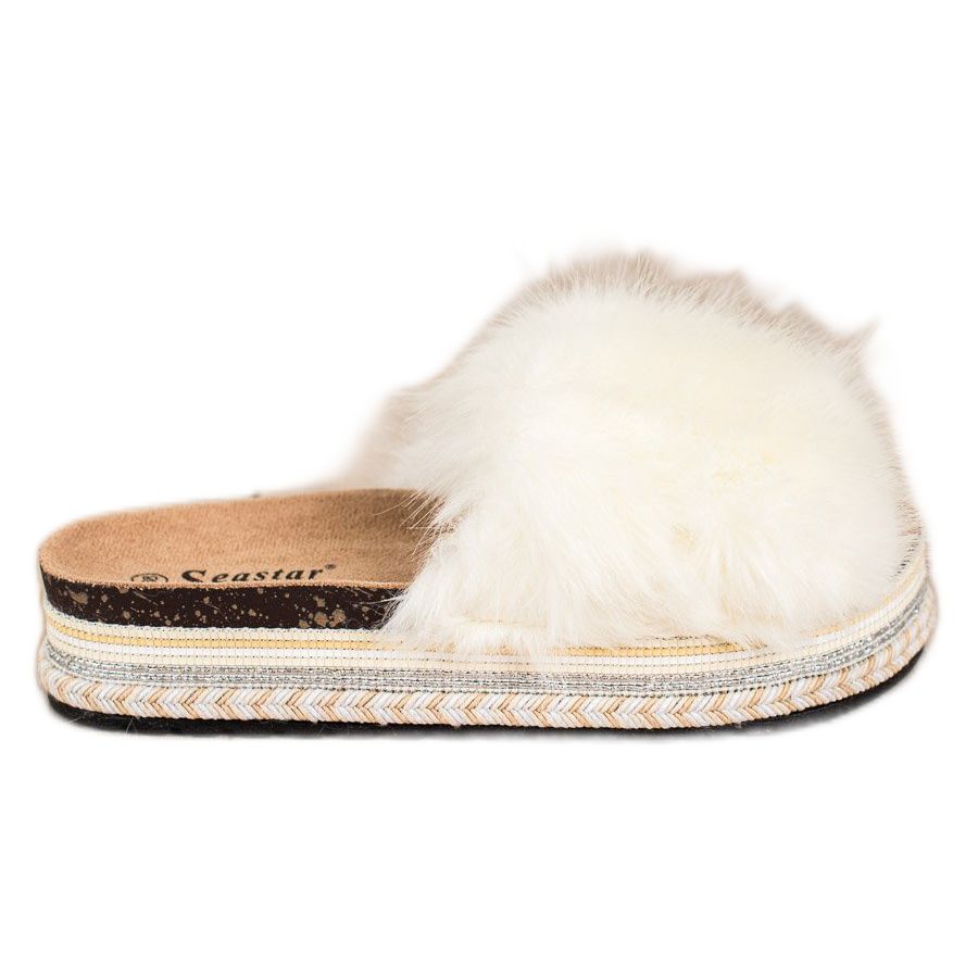 Upptäck sommartrender med fashionabla flip-flops på en dekorativ plattform från tillverkaren Seastar! Dessa vita flip-flops utmärker sig inte bara genom sitt eleganta utseende, utan också genom sin komfort att bära och ekologiska material. Mjuk, helt ekologisk päls omsluter dina fötter, och tygets innersula säkerställer komfort hela dagen. Under dina dagliga promenader kan du njuta av lätthet tack vare den syntetiska sulan med slitbana som ger bra grepp.