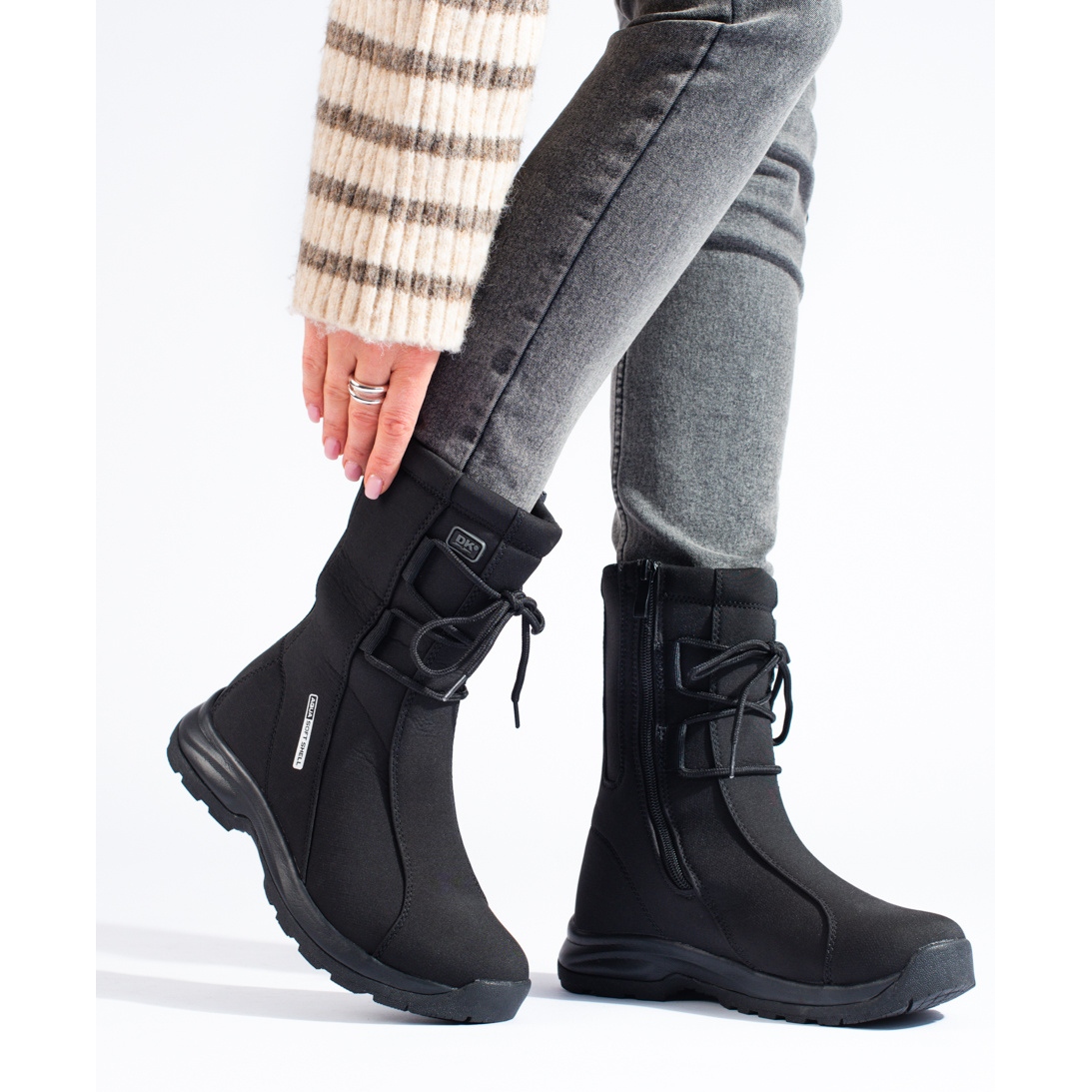 Sulan med slitbana, gjord av syntetmaterial, garanterar utmärkt grepp även i svår terräng. Tack vare en 3,5 cm hög plattform och en bred ovandel (26-28 cm) ger de stabilitet, och dragkedjan och snörningsjusteringarna möjliggör enkel anpassning till individuella behov.