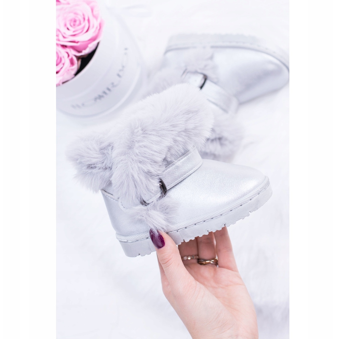 Skornas silverfärg gör dem inte bara praktiska, utan också extremt fashionabla. Stor päls runt ovandelen ger charm och gör varje steg bekvämt och varmt. Den övre höjden på 10 cm ger tillräckligt stöd, och plattformen på 2 cm låter barn springa och leka fritt.