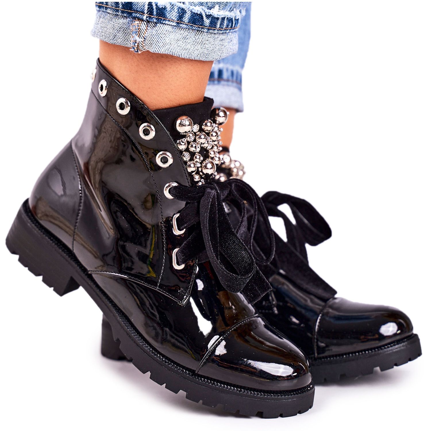 Detaljer: MSMG Varma damstövlar med metalliska pärlor och band, lackerade Perla svart