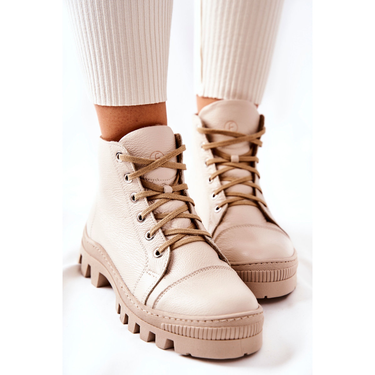 Den höga ovandelen, som når 11 cm, med en rund tå, framhäver det fashionabla utseendet på stövlarna, och snörning ger en perfekt passform till benets bredd. Den beige färgen är i linje med dagens trender och passar samtidigt perfekt till olika stilar.