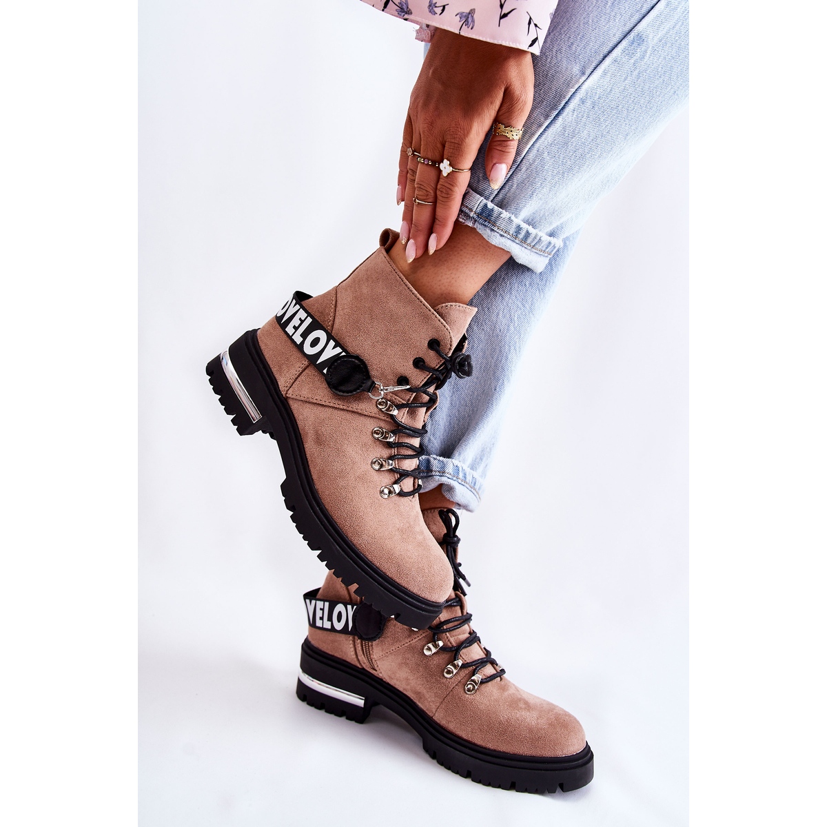 Stövlarna är försedda med en förstyvad häl och en klassisk knytband, vilket säkerställer rätt passform mot foten. Dessutom finns på sidan av ovandelen en praktisk dragkedja som gör det lättare att ta av och på skorna. Den avtagbara remmen med en inskription är en original accent som ger skorna en unik karaktär.