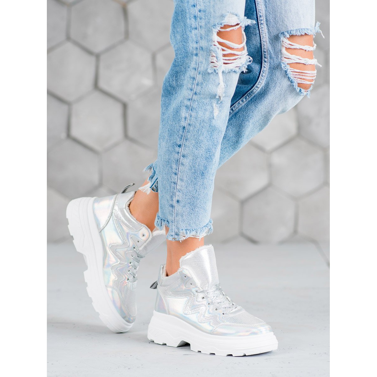 Sneakersna är utrustade med en 5 cm hög sliten sula, vilket inte bara ökar bärkomforten, utan också säkerställer ett utmärkt grepp på olika underlag. Isolering gjord av en skofilt håller dina fötter varma även under kallare dagar. En snörning och en mjuk, inbyggd häl garanterar stabilitet och komfort att bära.