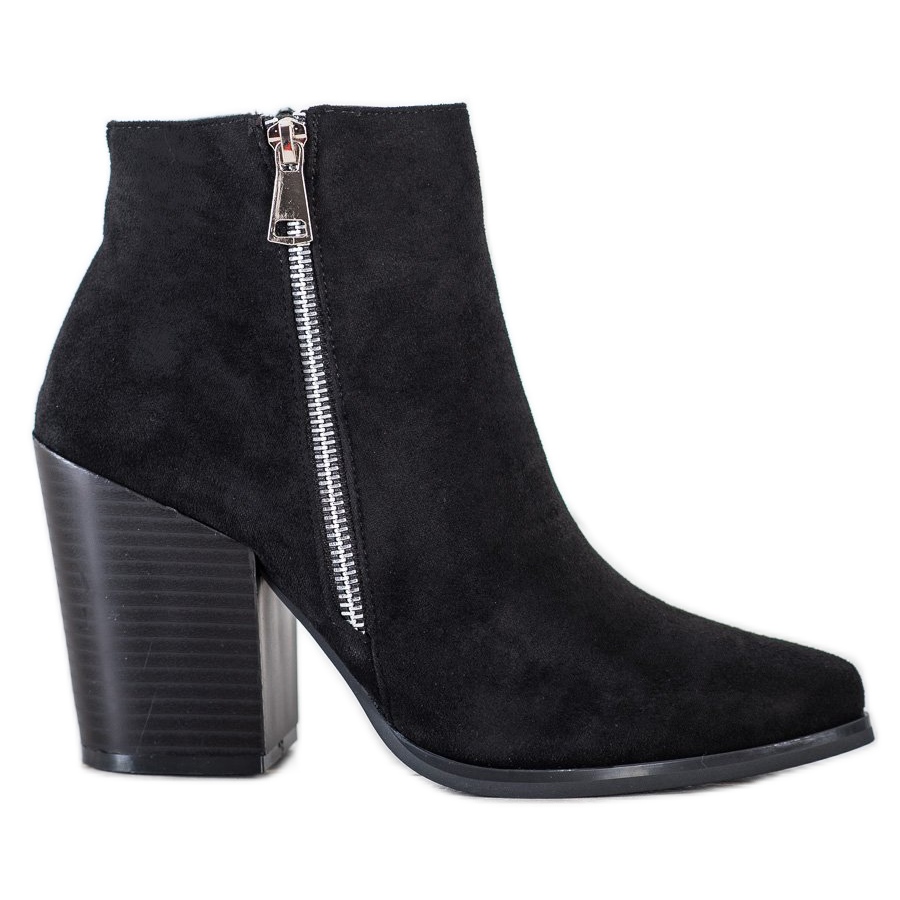 Insidan av skorna är fodrad med textilmaterial, vilket säkerställer tillräcklig värme för fötterna under kallare dagar. En ytterligare fördel är en dekorativ dragkedja som ger dem en unik karaktär. Den spetsiga tån och den inbyggda, mjuka hälen gör att stövlarna inte bara ser vackra ut, utan också sitter perfekt på foten.