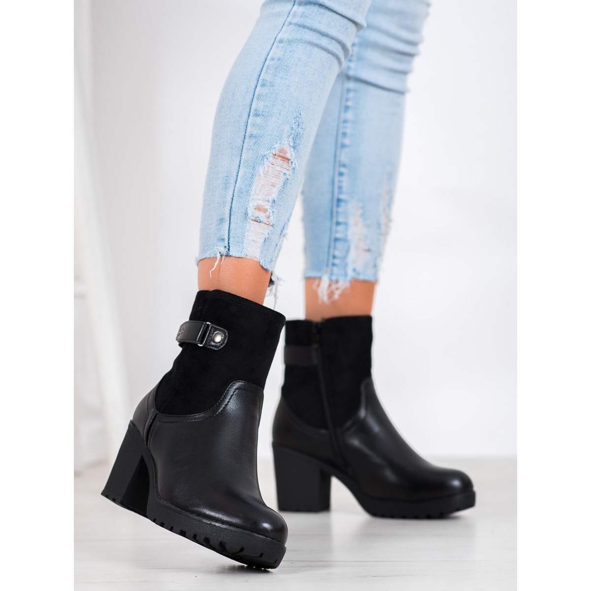 Med en klackhöjd på 8 cm erbjuder dessa ankelstövlar stabilitet, medan en liten plattform framtill säkerställer komfort även vid långa promenader. En inbyggd, förstyvad häl och en praktisk dragkedja gör det enkelt att ta på och av skorna. En ytterligare fördel är den dekorativa remsan som ger dem en unik karaktär.
