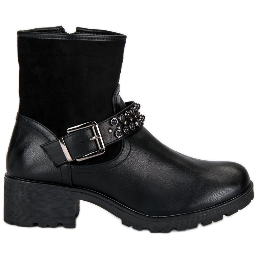 Insidan av stövlarna är fodrad med varmt fårskinn, vilket gör dem till ett perfekt val för kalla dagar. Den svarta färgen, som alltid är på topp, gör dessa arbetare lätta att matcha med olika stilar - från avslappnad till mer elegant. Ett dekorativt spänne och detaljer med strass ger karaktär, och den låga klackhöjden (5 cm) säkerställer komfort hela dagen.