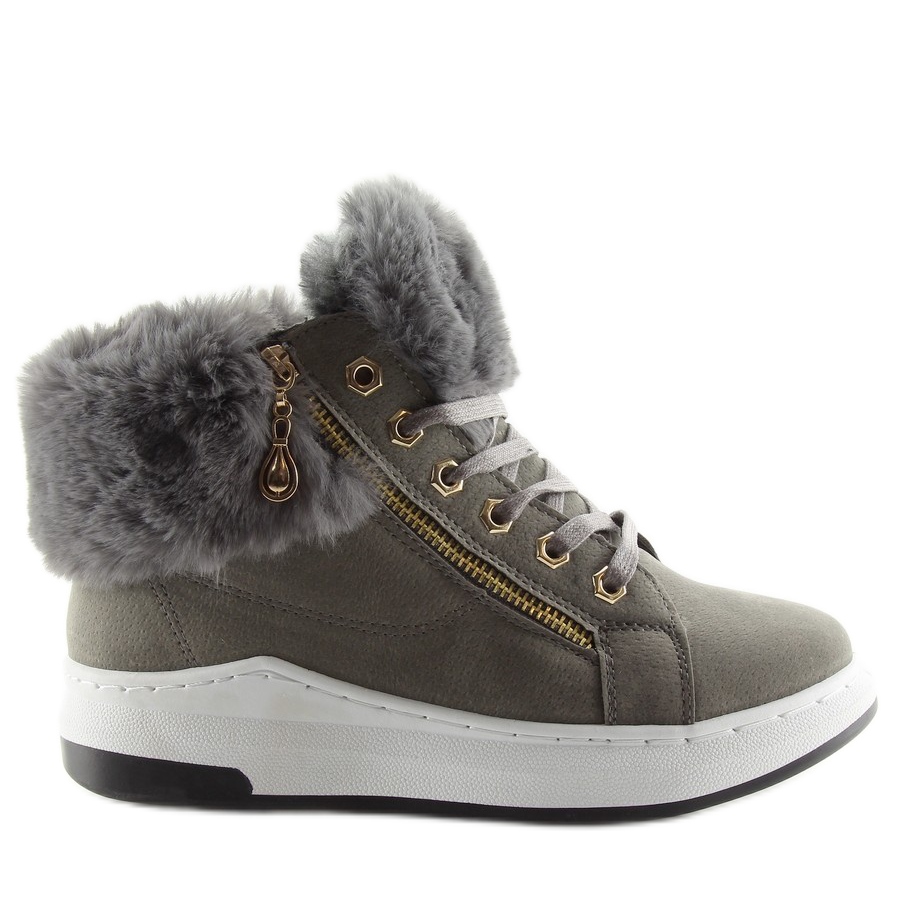 Isolerade grå sportskor 16-529 grå är det perfekta valet för kvinnor som vill kombinera komfort med en moderiktig look. Dessa snygga sneakers kännetecknas av originalpäls placerad längs ankeln, vilket ger dem lite värme och elegans, vilket bryter den sportiga karaktären hos skorna. En ytterligare fördel är den gyllene dragkedjan som ger skorna en unik och modern design.