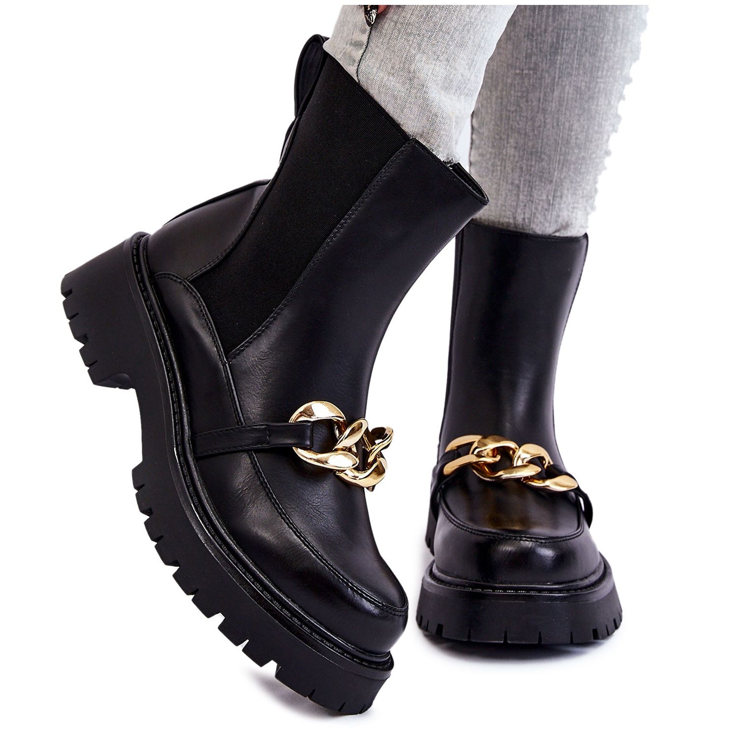 En av de viktigaste delarna i denna modell är den imponerande kedjan på framsidan, som ger helheten en originell karaktär. Stövlarna har en platt 5 cm hög klack och räfflade sulor, vilket säkerställer stabilitet och säkerhet under gång. Deras minimalistiska svarta färg gör att de passar perfekt till olika stilar, både för vardagsbruk och för mer formella tillfällen.