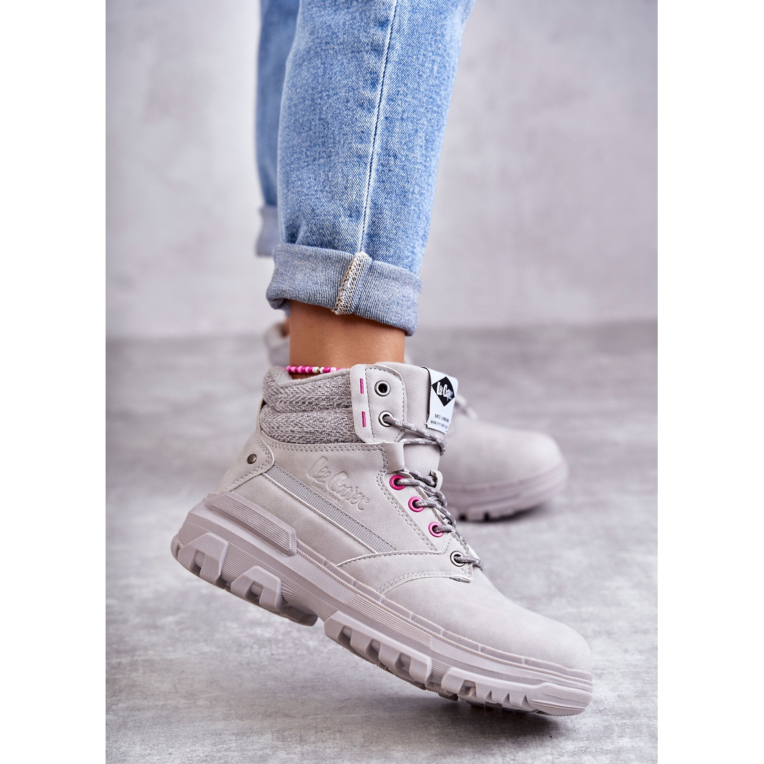 Isolerade Trapper Boots för kvinnor Lee Cooper LCJ-22-01-1373 i grått är den perfekta kombinationen av stil och komfort, perfekt för kallare dagar. Dessa stövlar är gjorda av ekologiskt läder och kännetecknas av en styvad häl, vilket säkerställer stabilitet och komfort att bära.