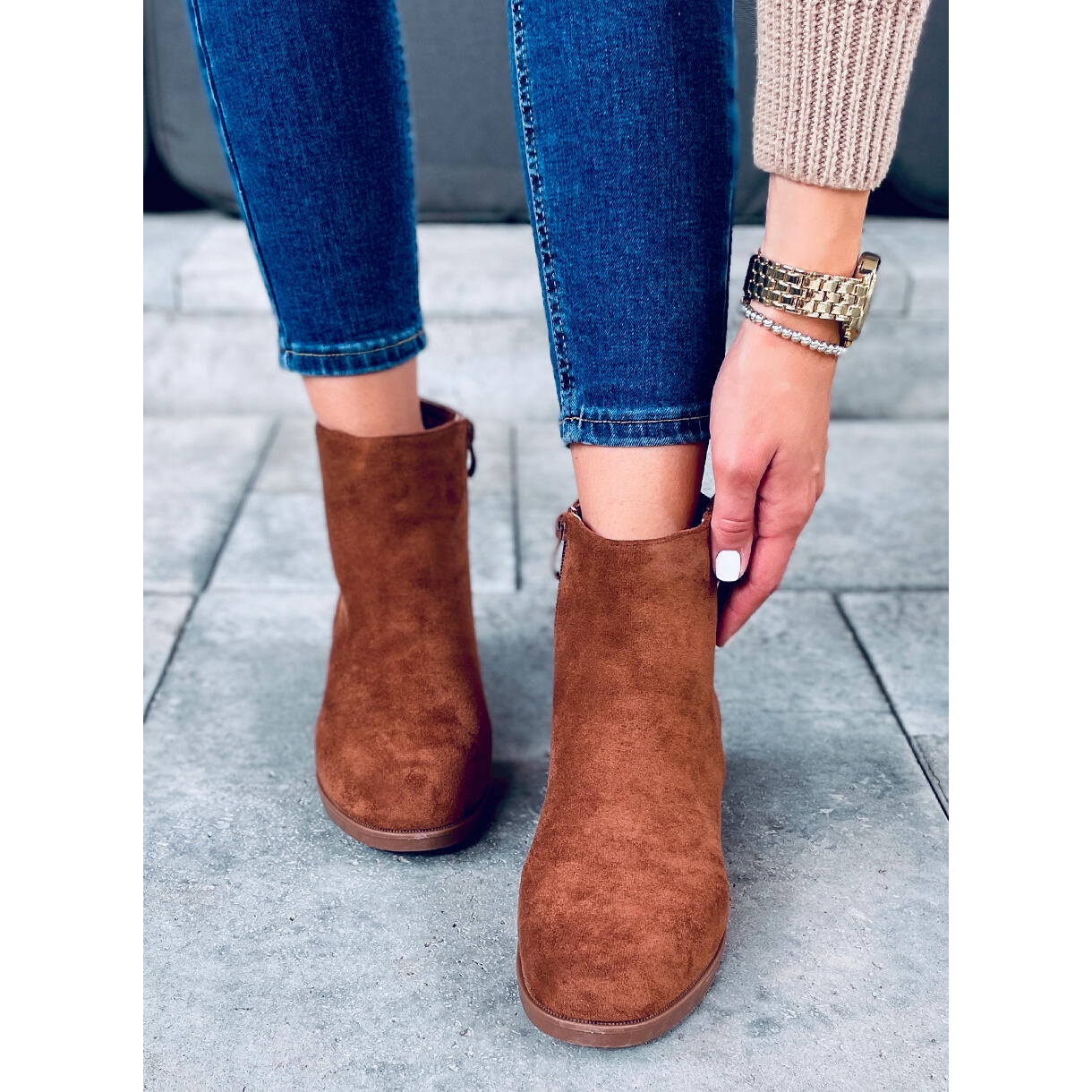 Modellen är designad för att vara enkel att ta på sig - ett bekvämt blixtlås gör att ta på och av skorna snabbt och problemfritt. Dessa ankelboots är gjorda av miljövänlig mocka och kombinerar estetik med ett miljövänligt tillvägagångssätt.