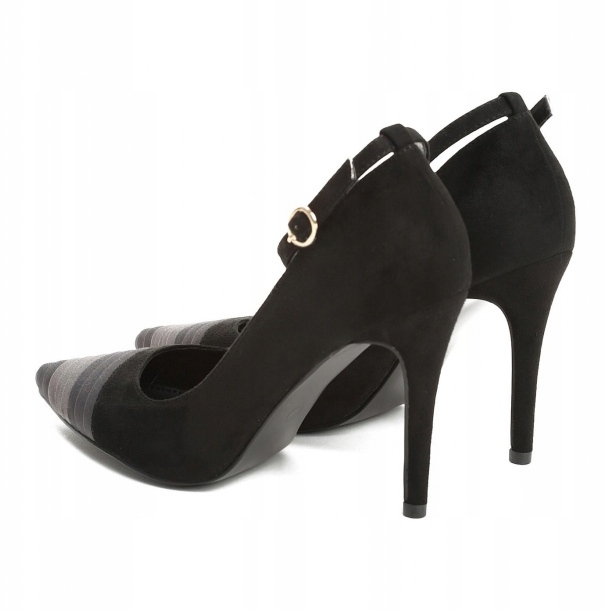 De svarta pumparna kännetecknas av en kraftigt rundad, spetsig tå och en inbyggd häl, vilket ger dem en unik charm. En tunn rem med spänne säkerställer inte bara stabilitet, utan framhäver också fotens känslighet. Också anmärkningsvärt är tilläggen i form av grå ränder på tårna, vilket ger skorna en unik karaktär.