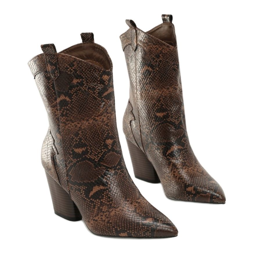Stövlarna är gjorda av högkvalitativt eko-läder som imiterar ormskinn och har ett djurmönster som kommer att ge karaktär till varje styling. Insidan av skorna är lätt isolerad med konstgjord päls, vilket säkerställer värme under kallare dagar. Den spetsiga tån och koniska hälen med en höjd på 8 cm ger en smal figur, vilket gör dem inte bara bekväma utan också extremt feminina.