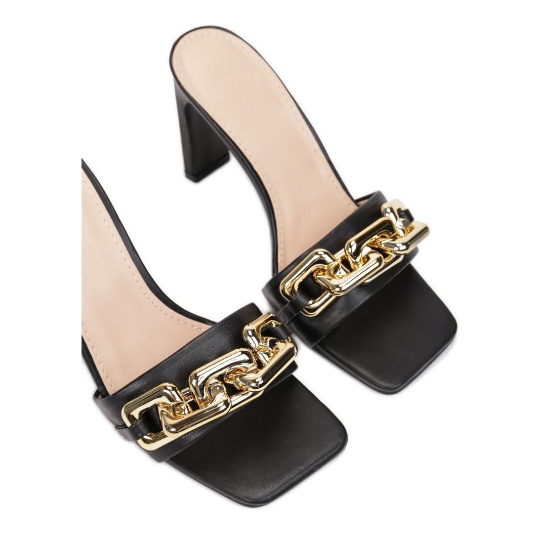 Vi presenterar Vices 1C-38 högklackade flip-flops i en elegant svart färg som säkerligen kommer att glädja alla modeälskare. Deras klassiska design har kompletterats med en modern accent - en guldkedja som dekorerar ett brett bälte. Flip-flopsna har en 9,5 cm klack, vilket ger en smalare siluett och samtidigt säkerställer bekvämt bärande tack vare slip-on designen.