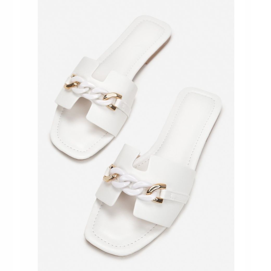Vices 2136-71 flipflops i en elegant vit färg är det perfekta valet för varje kvinna som letar efter komfort och stil varje dag. Dessa slip-on mulor kännetecknas av en öppen fyrkantig tå, vilket ger dem ett modernt utseende. En bred rem vid tårna, dekorerad med en iögonfallande kedja i matchande färg, ger karaktär och gör flip-flopsna inte bara bekväma, utan också moderiktiga.