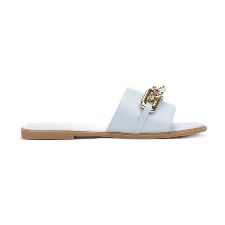 Vi presenterar Vices 2338-51-blå flip-flops, som är en perfekt kombination av komfort och moderiktig design. Dessa slip-on mulor, tillgängliga i en vacker blå färg, utmärks av ett original tie dye motiv och en elegant kedja i en gyllene nyans på en bred rem. Deras fyrkantiga tå ger dem en modern karaktär, vilket gör att de passar perfekt för säsongens trender.