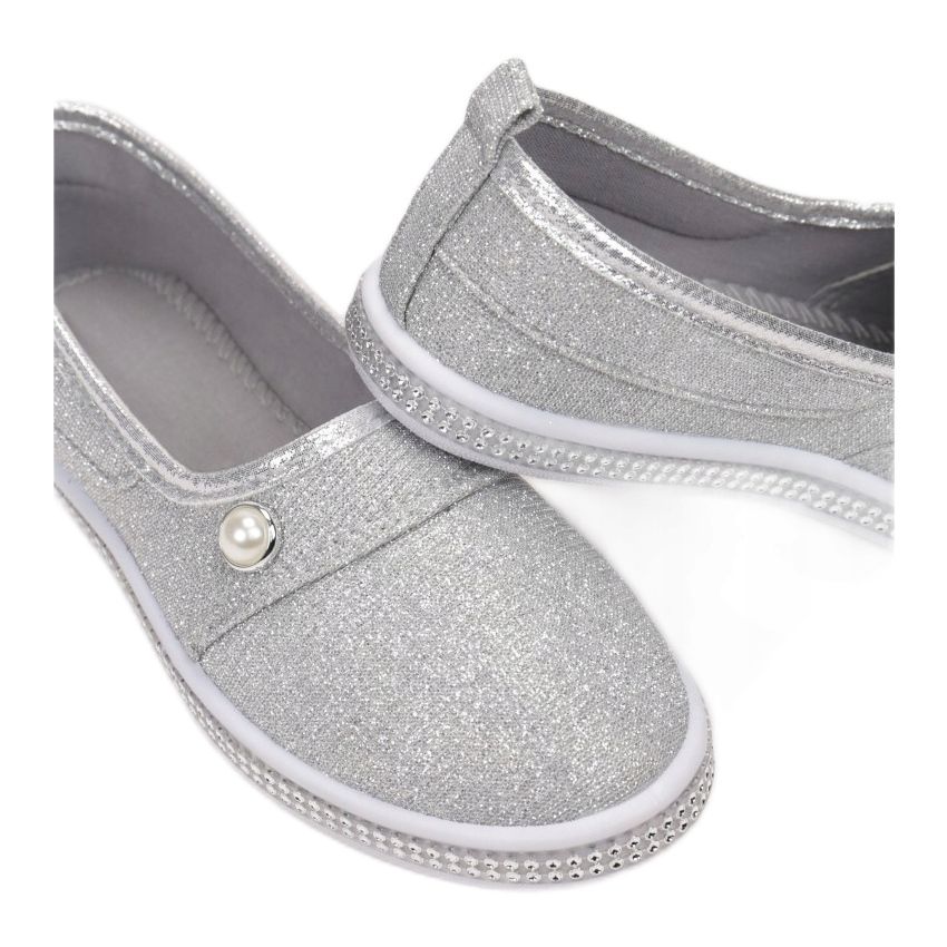 En fashionabel accent är den imiterade zirconia-kanten som omger sulan, som lägger till glans till skorna. På framsidan finns dessutom en liten applikation som imiterar en pärla, vilket ger det hela en unik karaktär. Gjorda av textilmaterial gläder sneakersna inte bara med sitt utseende, utan också med sin funktionalitet - metalltrådar gör dem moderna.