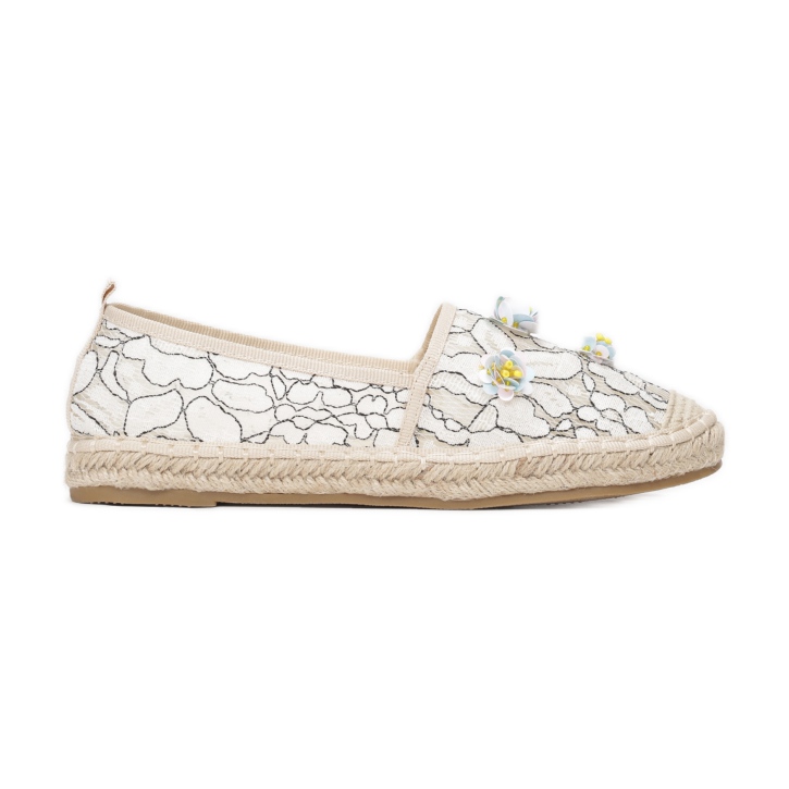 Tillverkade av högkvalitativt tyg, espadrillor erbjuder lätthet och andningsförmåga, vilket är särskilt viktigt under varma dagar. Insidan av skorna är fodrad med textilmaterial, vilket gör den behaglig att bära, och den 1,5 cm höga platta sulan garanterar stabilitet och komfort under gång. Den beige färgen passar perfekt till många stilar, från avslappnad till mer elegant.