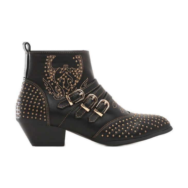 Stövlarna knäpps med dragkedja i sidan vilket gör dem lätta att ta av och på. Dessutom är deras design berikad med subtila detaljer i form av små strass och tre snygga spännen som ger dem originalitet. Den mandelformade tån och den höga fotleden ger elegans och chic, och den syntetiska sulan säkerställer hållbarhet och stöd vid varje steg.